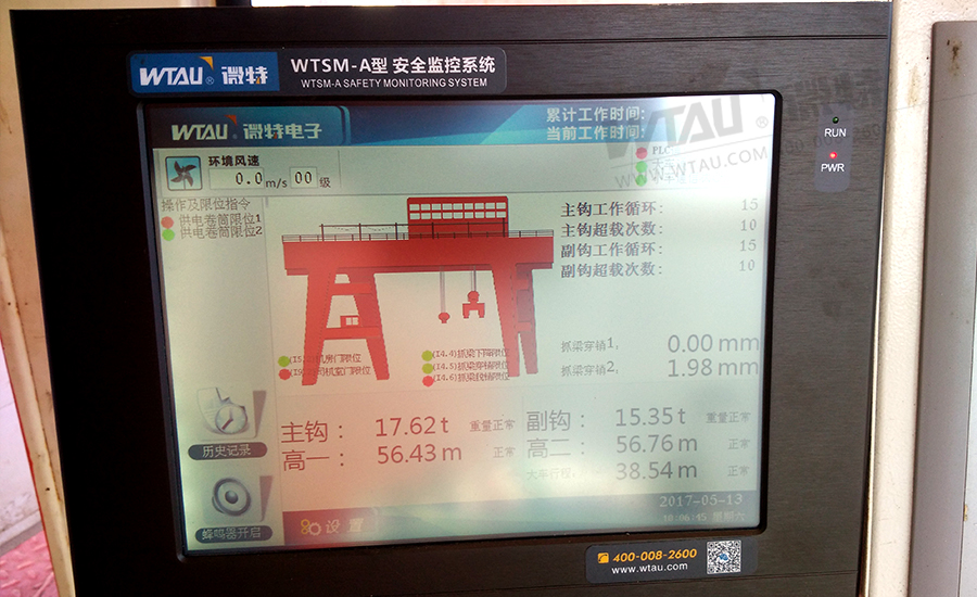 微特安全監(jiān)控系統(tǒng),對門機運行工況進(jìn)行實時采集,實時記錄。進(jìn)行數(shù)據(jù)核算比對,顯示畫面比傳統(tǒng)儀表更直觀、更友好。在門機運行接近限定值、規(guī)定值,系統(tǒng)將對司機做出提醒,在到達(dá)限定值時將警告司機,并停止司機的危險操作。