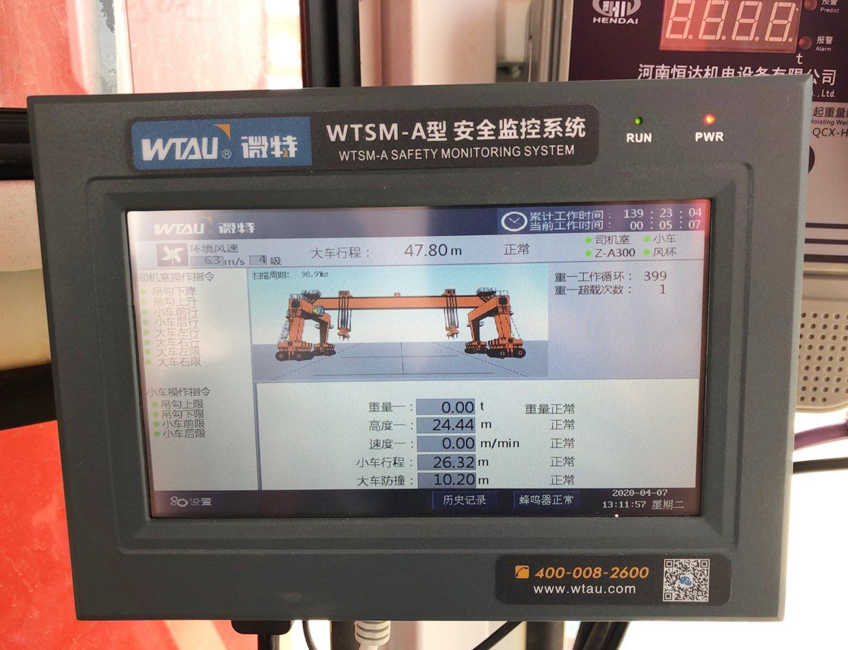 微特為該提梁機配裝的安全監(jiān)控系統(tǒng)對該設備的安全可靠運行起著重要作用。微特研發(fā)的提梁機安全監(jiān)控系統(tǒng)對設備的運行數(shù)據(jù)進行實時監(jiān)控,該儀表可以顯示提梁機的起升高度,起重量,速度,大車行程,小車行程,同軌道防碰撞,風速,工作次數(shù),超載次數(shù)等相關數(shù)據(jù)實時顯示,并對相關數(shù)據(jù)進行分析判斷,防止設備向不安全區(qū)域運行。當往不安全區(qū)域運行時,該系統(tǒng)首先會預警,并發(fā)出聲光報警提醒操作人員,并根據(jù)實際情況啟動控制功能,使設備相關運行機構停止運行,以起到保護作用。
