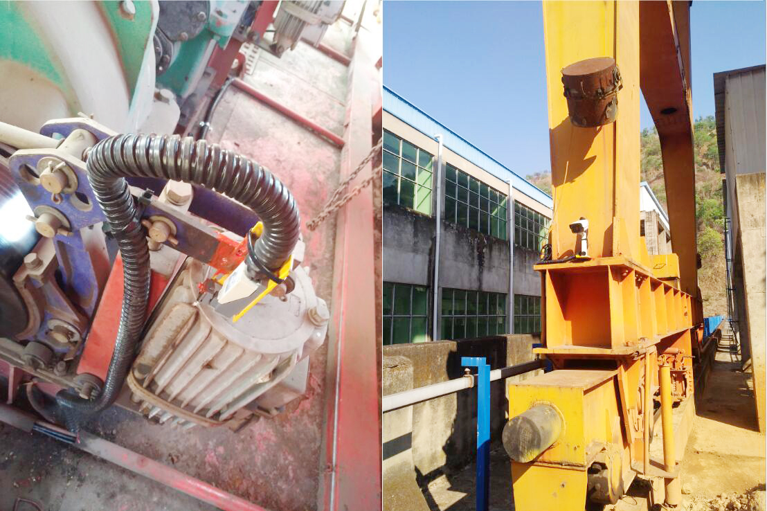 抵達(dá)當(dāng)天,清點貨物、辦完相關(guān)開工手續(xù)后開始了緊鑼密鼓的安裝工作。壩頂門機設(shè)備使用年限較長,在本次施工過程中,發(fā)現(xiàn)的一些設(shè)備問題,隨即與客戶溝通并解決:如夾軌器狀態(tài)開關(guān)動作不到位,大小車行程限位開關(guān)因生銹,開關(guān)觸點接觸不靈,影響門機使用安全等。施工過程中更換了新的大小車行程限位開關(guān),調(diào)整了夾軌器狀態(tài)開關(guān)動作位置及并對其它部位進(jìn)行了檢查,在雙方的共同努力下,問題得到一一解決。