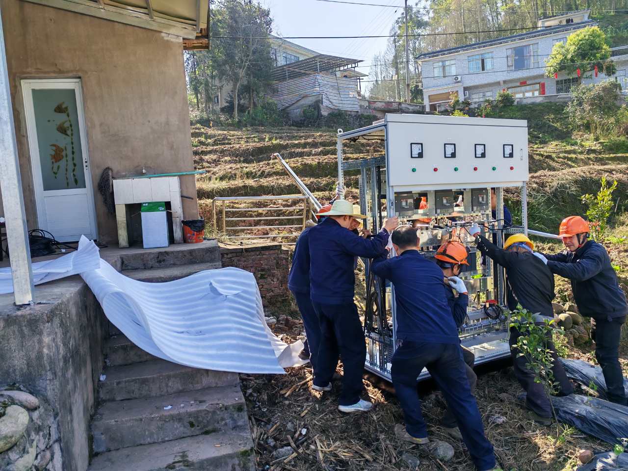 施工時(shí),現(xiàn)場上方電纜與低矮屋檐阻礙吊車作業(yè),超 700斤的盤柜只能人工搬運(yùn)。且僅有 48 小時(shí)斷電窗口,否則將威脅周邊農(nóng)田。微特工程師們迎難而上,提前規(guī)劃搬運(yùn)路線、選用可靠工具,分組協(xié)作搬運(yùn)盤柜。他們開啟晝夜奮戰(zhàn)模式,爭分奪秒,成功在規(guī)定時(shí)間內(nèi)完成三臺水泵盤柜更換,及時(shí)恢復(fù)泵站運(yùn)行,守護(hù)了農(nóng)田安全。