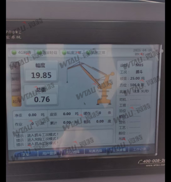 微特動態(tài)稱重系統(tǒng)通過接入重量傳感器實現(xiàn)精準計量,吊裝精度≤0.87%;視頻監(jiān)控從單一吊點擴展到整車關鍵機構,實現(xiàn)全方位覆蓋;搭配10.4寸大觸摸屏與圖形化界面,操作便捷且便于查詢事件故障;作業(yè)數(shù)據實時傳輸至服務器,支持生成月度報表輔助績效考核,實現(xiàn)智能高效協(xié)同。