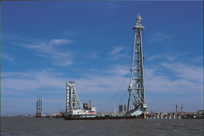 “三航樁108”于2009年7月建造完成并投入使用,總長71.7米,型寬27米,型深5.2米,樁架高108米, 是當時國內最高的打樁船。最大沉樁樁徑可達3米,最大吊重2×120噸,適用于大型跨海橋梁和深水港口大直徑打樁施工使用。