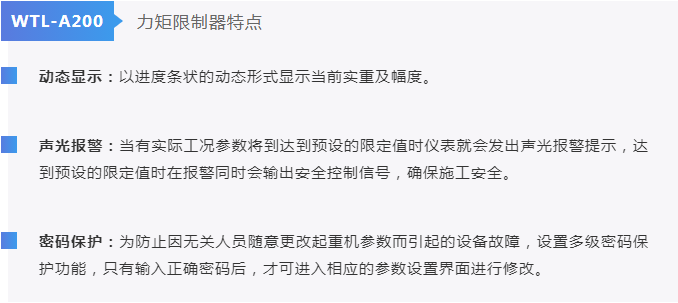 經(jīng)過工程師現(xiàn)場調(diào)研與多次溝通,最終選用了WTL-A200型力矩限制器,該力矩限制器擁有性價比高、運行穩(wěn)定、通用性強(qiáng)等特點,已廣泛運用于各力矩起重機(jī)上,備受客戶好評。