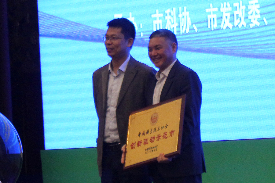 中國(guó)科協(xié)“創(chuàng)新驅(qū)動(dòng)示范市”授牌儀式上,中國(guó)科協(xié)學(xué)會(huì)服務(wù)中心副主任徐強(qiáng)(左)授牌,副市長(zhǎng)王應(yīng)華(右)接牌。