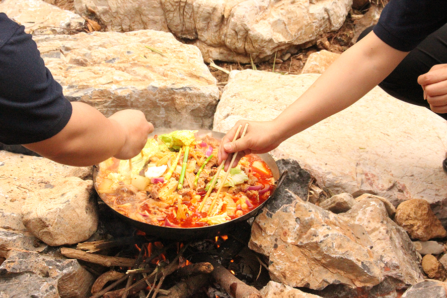 經(jīng)過半天的登山式行軍,中午,我們來到山谷中一處較平坦地地方,各隊(duì)開始分工埋鍋造飯,相互配合做中餐。