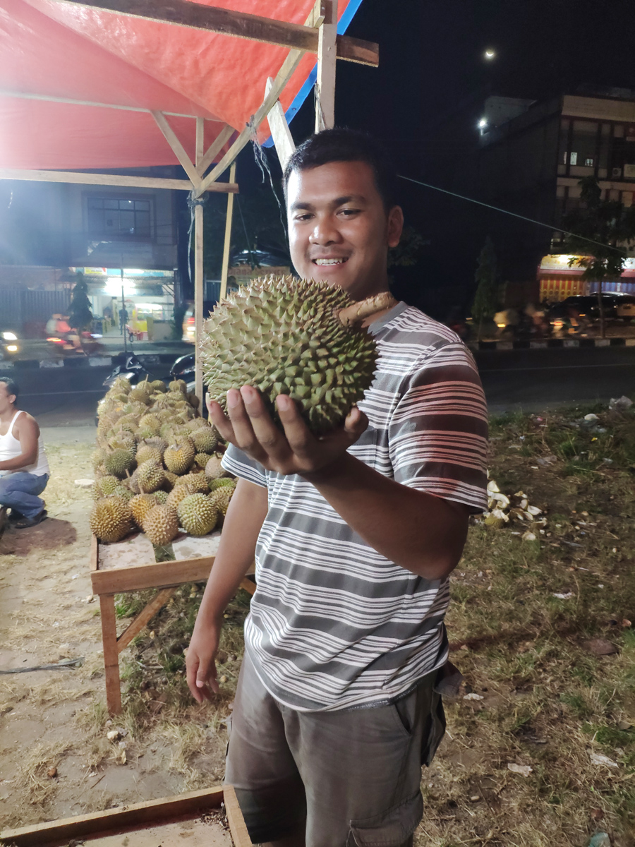 因?yàn)槊尢m與北干巴魯同在蘇門(mén)答臘島,棉蘭的小榴蓮在北干特別便宜,只需15000(約7.5人民幣)印尼盧比,就能飽飽吃上一整個(gè)榴蓮,是不是很劃算呢?吃完了榴蓮,味道太大怎么辦?往榴蓮殼里倒上水,等上三五分鐘,喝下去,消火去味兒,這可是當(dāng)?shù)厝瞬惠p易告知的絕技呢。