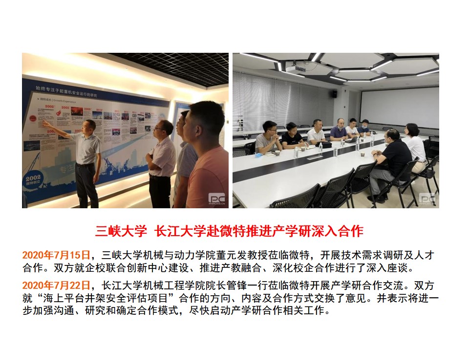 在這特殊的一年里,微特人攻堅克難完成全球規(guī)模最大、技術難度最高的三峽升船機的閘首橋機可靠性提高項目,為三峽升船機順利復航提供保障;微特人敢為人先承接定制化攀鋼起重機智能運維系統(tǒng)、振華重工卸船機稱重系統(tǒng)等重大項目,貼身為一流鋼鐵船舶企業(yè)服務;微特人開拓進取與中水七局、中建四局等企業(yè)合作研發(fā)起重機運行關鍵技術項目取得重大突破;微特人勤勉努力不斷深化與全球最大石油生產(chǎn)公司沙特 Aramco、全球頂級起重機品牌DEMAG、Liebherr之間的合作,成果豐碩。