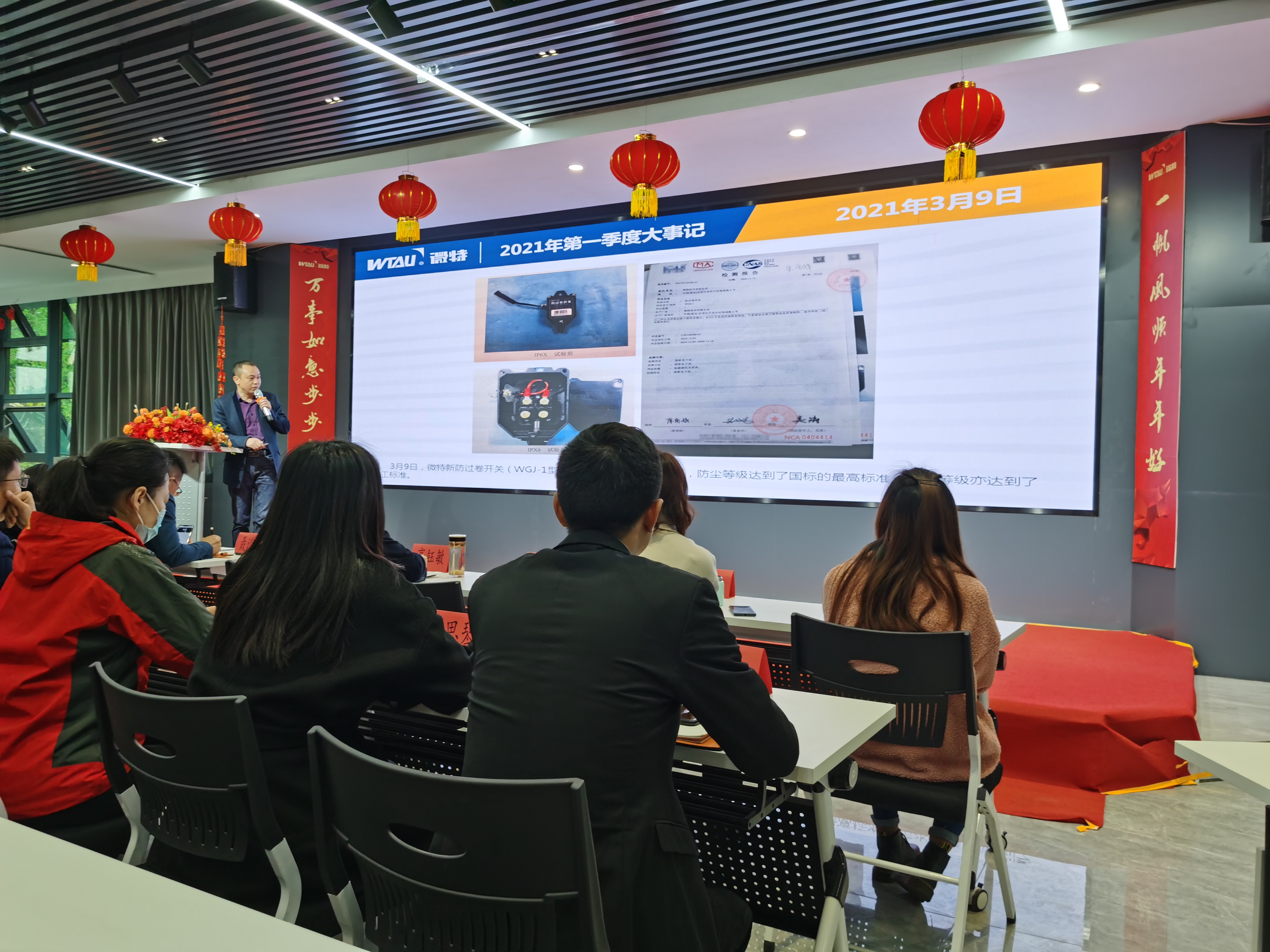 會議開始,輪值CEO李彬?qū)Φ谝患径冗M行了總結(jié)回顧,季度伊始聶董發(fā)表了“感恩有你攜手同行,牢記使命整裝再發(fā)”的2021年新年致辭,隨后在所有同仁的見證下湖北傳感物聯(lián)產(chǎn)業(yè)技術(shù)研究院揭牌儀式成功舉辦,同時微特度過了19歲生日。聶董作為人大代表參加了湖北省第十三屆人民代表大會第五次會議的系列會議,輪值CEO李彬被授予“宜昌市優(yōu)秀青年科技工作者”稱號,微特智慧谷總經(jīng)理郭麗麗榮獲宜昌市“杰出創(chuàng)業(yè)女性”榮譽稱號。這一季度微特參與三項世界第一的常泰長江大橋建設(shè),新防過卷開關(guān)(WGJ-1型)通過IP66防護等級認(rèn)證,海工、船舶、水電、訂單保障中心、研發(fā)中心、經(jīng)營管理部、孵化器等各部門都取得了優(yōu)異的工作成果。