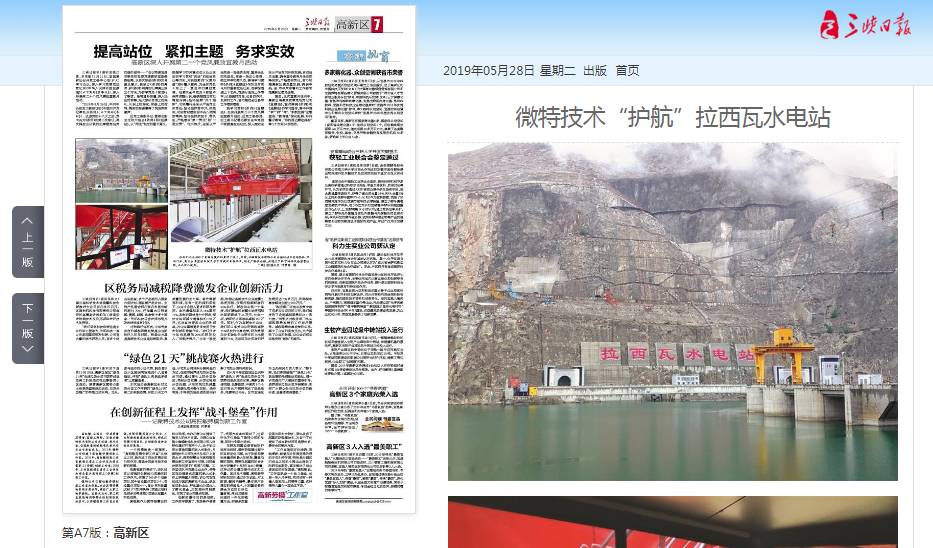 2019年5月28日,三峽日報第A7版高新區(qū)專欄刊等圖文消息:微特技術(shù)“護(hù)航”拉西瓦水電站。