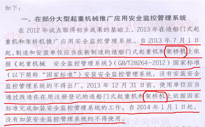 根據(jù)最新國(guó)家標(biāo)準(zhǔn)《起重機(jī)械 安全監(jiān)控管理系統(tǒng)》GB/T 28264-2012(2012年5月1日發(fā)布,2012年7月1日實(shí)施);