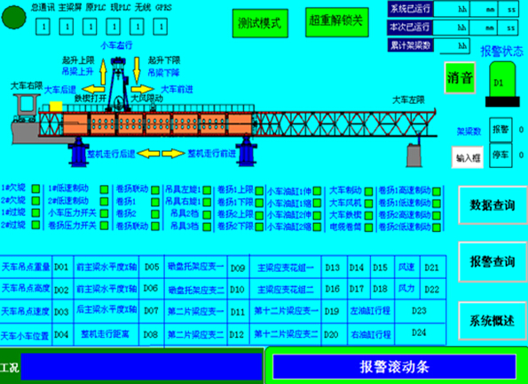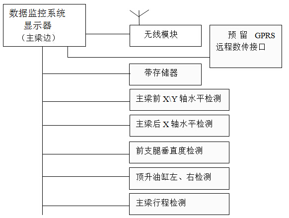 由于該拼裝架橋機(jī)的特殊性,本套系統(tǒng)方案配備有信號(hào)采集裝置(下位機(jī))1臺(tái)和一套圖形顯示終端含存儲(chǔ)(上位機(jī)),能夠?qū)崟r(shí)的顯示所監(jiān)控的各個(gè)參數(shù),并對(duì)所有的監(jiān)控對(duì)象能作出顯示、報(bào)警、數(shù)據(jù)分析、查詢、記錄及動(dòng)作輸出等功能。數(shù)據(jù)保存能保存30個(gè)連續(xù)工作日。設(shè)備數(shù)據(jù)具有導(dǎo)出功能,通過(guò)USB口或網(wǎng)口可將數(shù)據(jù)導(dǎo)出作為長(zhǎng)久保存用。設(shè)備具備遠(yuǎn)程通訊接口,可將數(shù)據(jù)和視頻通過(guò)GPRS或3G模塊將數(shù)據(jù)發(fā)至服務(wù)器,實(shí)現(xiàn)遠(yuǎn)程監(jiān)控。