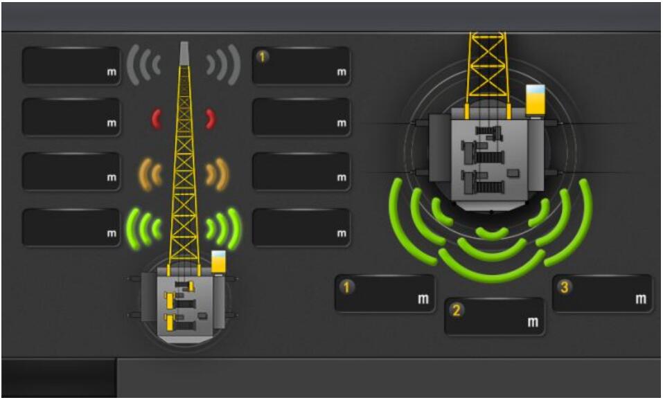 區(qū)域主動防碰撞系統(tǒng): 通過雷達主動監(jiān)測起重機易碰運動部位路徑,探測區(qū)域空間內(nèi)是否有障礙物,以此來避免吊機與吊機間,回轉部位與其它物體、臂架與周邊物體之間的區(qū)域空間是否安全,在安全區(qū)被入侵時發(fā)出聲、光報警,甚至給出止停控制信號,實現(xiàn)主動防碰撞監(jiān)測保障設備安全。
