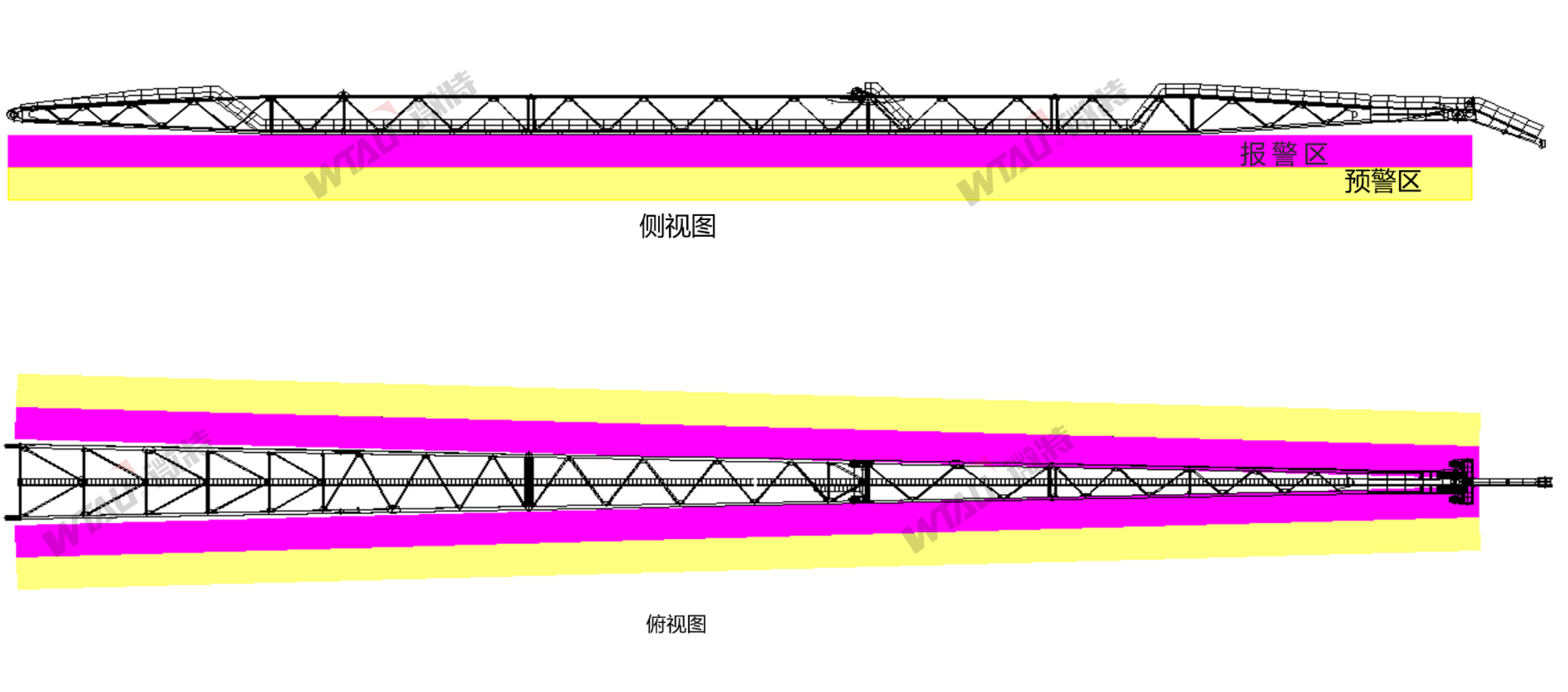 2.監(jiān)測臂架中部三面域,精確檢測物體,提供報聲、光預(yù)警和報警提示,預(yù)警/報警區(qū)域可個性化調(diào)整。