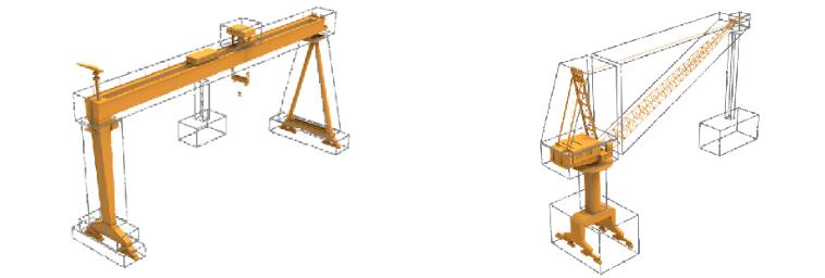 將關(guān)聯(lián)的吊機設(shè)備按實體結(jié)構(gòu)實際尺寸,分解成N個6面體數(shù)據(jù)模型,數(shù)據(jù)模型的基礎(chǔ)尺寸按吊機的實際幾何尺寸1:1比例設(shè)立,其真實地反映了吊機設(shè)備實體的裝配位置關(guān)系、外形尺寸。