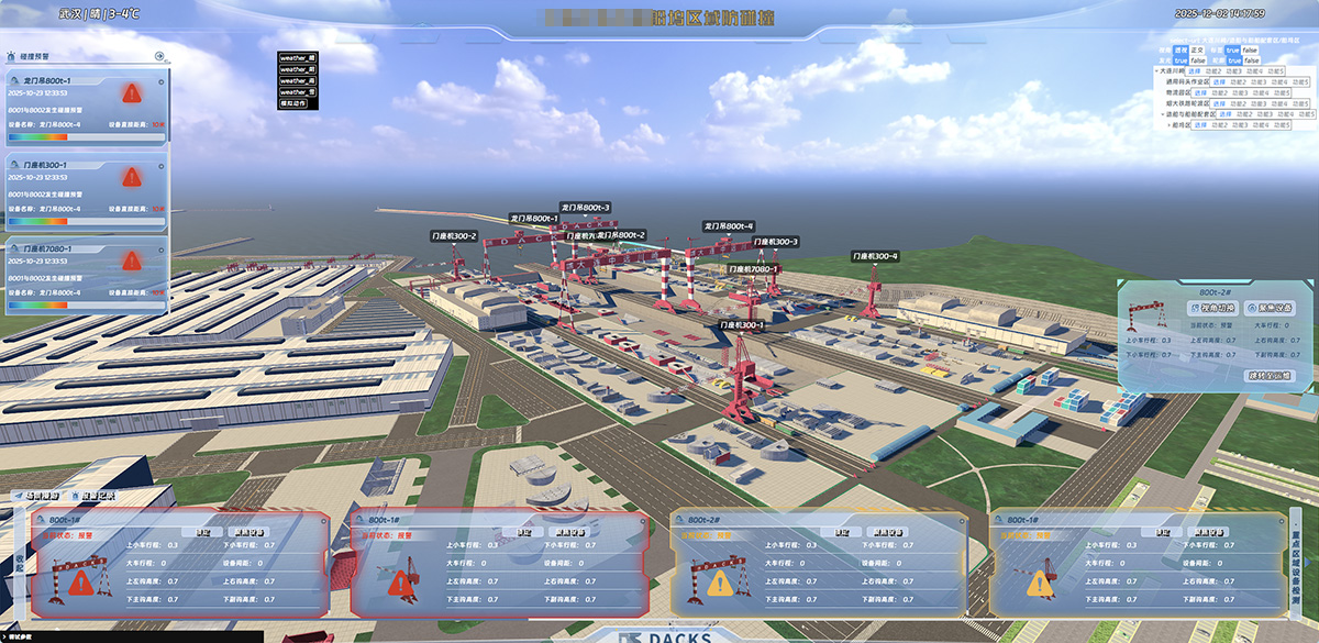 需要做集中集控管理的用戶,系統(tǒng)還需配置遠程三維監(jiān)控平臺。將船塢組裝場地進行三維場景模型處理,且需保證關(guān)鍵位置(如軌道位置關(guān)系等設(shè)備運行活動范圍)與設(shè)備產(chǎn)生空間關(guān)系的區(qū)域,按照1:1精確建模,并展示上做突出處理,保證能準確、清晰地反映設(shè)備當(dāng)前工況。
