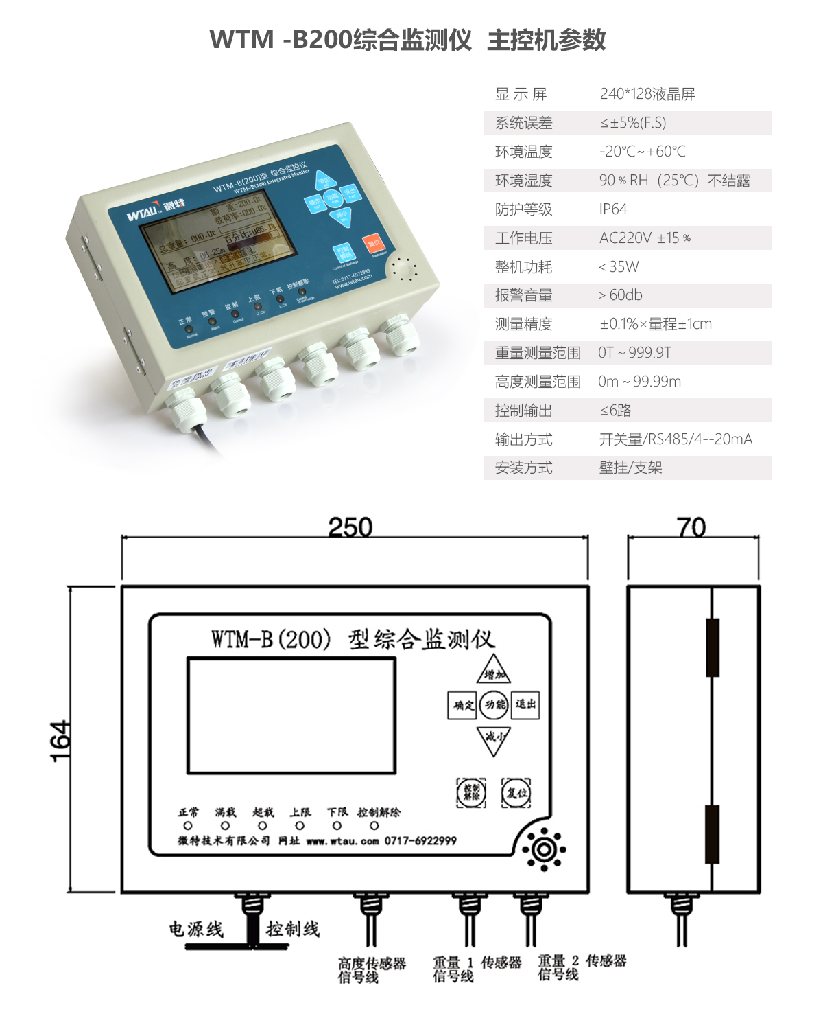 WTM-B200水電站綜合監(jiān)控儀可以輸入重量、高度、風(fēng)速、風(fēng)向、角度、幅度、溫度等信號,最多可輸出6個繼電器控制。適用于卷揚啟閉機(jī)多路重量及開度信號的控制。