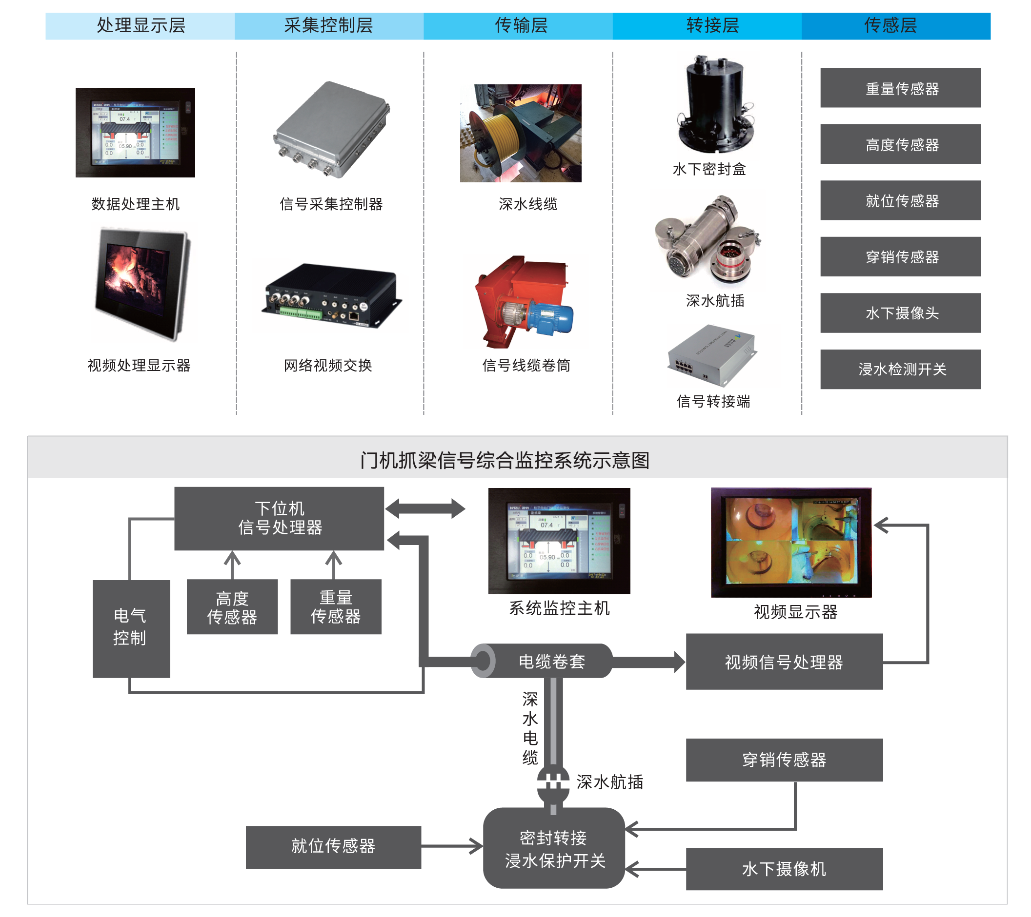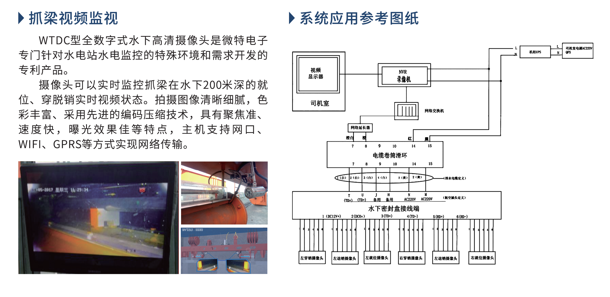 我公司根據(jù)市場(chǎng)客戶需求特殊研發(fā),液壓抓梁可視化綜合監(jiān)控系統(tǒng)通過實(shí)時(shí)動(dòng)態(tài)數(shù)據(jù)和水下可視化視頻方式(監(jiān) 控抓梁與閘門正常對(duì)位后,再進(jìn)行穿銷與閘門連接工作,在數(shù)據(jù)可視化下確認(rèn)抓梁穿銷到位后進(jìn)行起吊閘門,)以保 證在檢修機(jī)組或清污時(shí)液壓抓梁安全可靠的提放閘門。