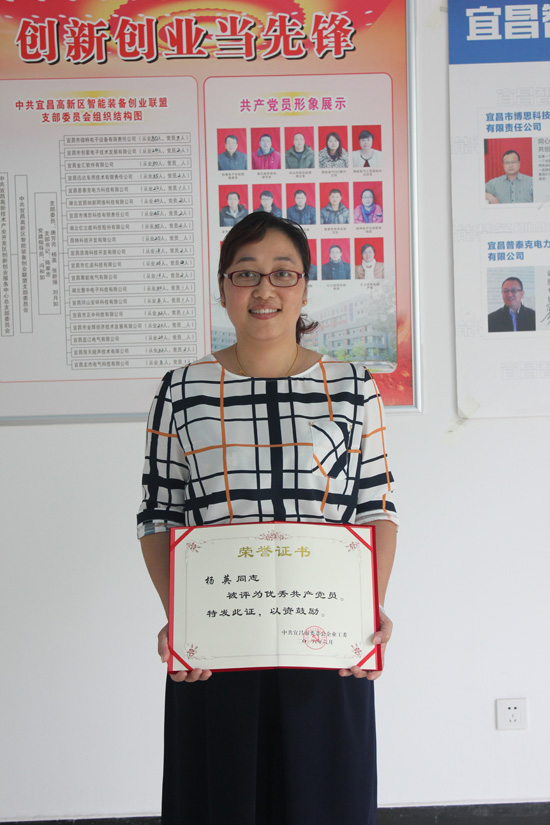 楊英同志擔(dān)任宜昌市微特電子設(shè)備有限責(zé)任公司倉(cāng)庫(kù)管理員,同時(shí)也是中共宜昌高新區(qū)智能裝備創(chuàng)業(yè)聯(lián)盟黨支部委員。平時(shí)工作兢兢業(yè)業(yè),成績(jī)顯著,同時(shí)積極發(fā)揮黨員先進(jìn)性作用,熱心幫助他人,帶動(dòng)同事共同成長(zhǎng)。在黨支部工作中,積極開展“兩學(xué)一做”,并積極擔(dān)任入黨介紹人,發(fā)動(dòng)身邊的優(yōu)秀人才入黨。