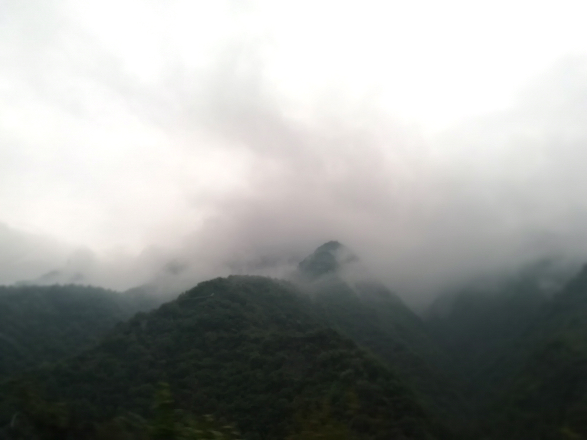 山上的路,和三年前一樣,一路上有大卡車在運(yùn)送著泥土或石子。有兩處工地,在做塌方修復(fù)施工。雨慢慢也下大了,逐漸的山里霧氣彌漫,能見(jiàn)度不足100米,車速越來(lái)越慢了。
