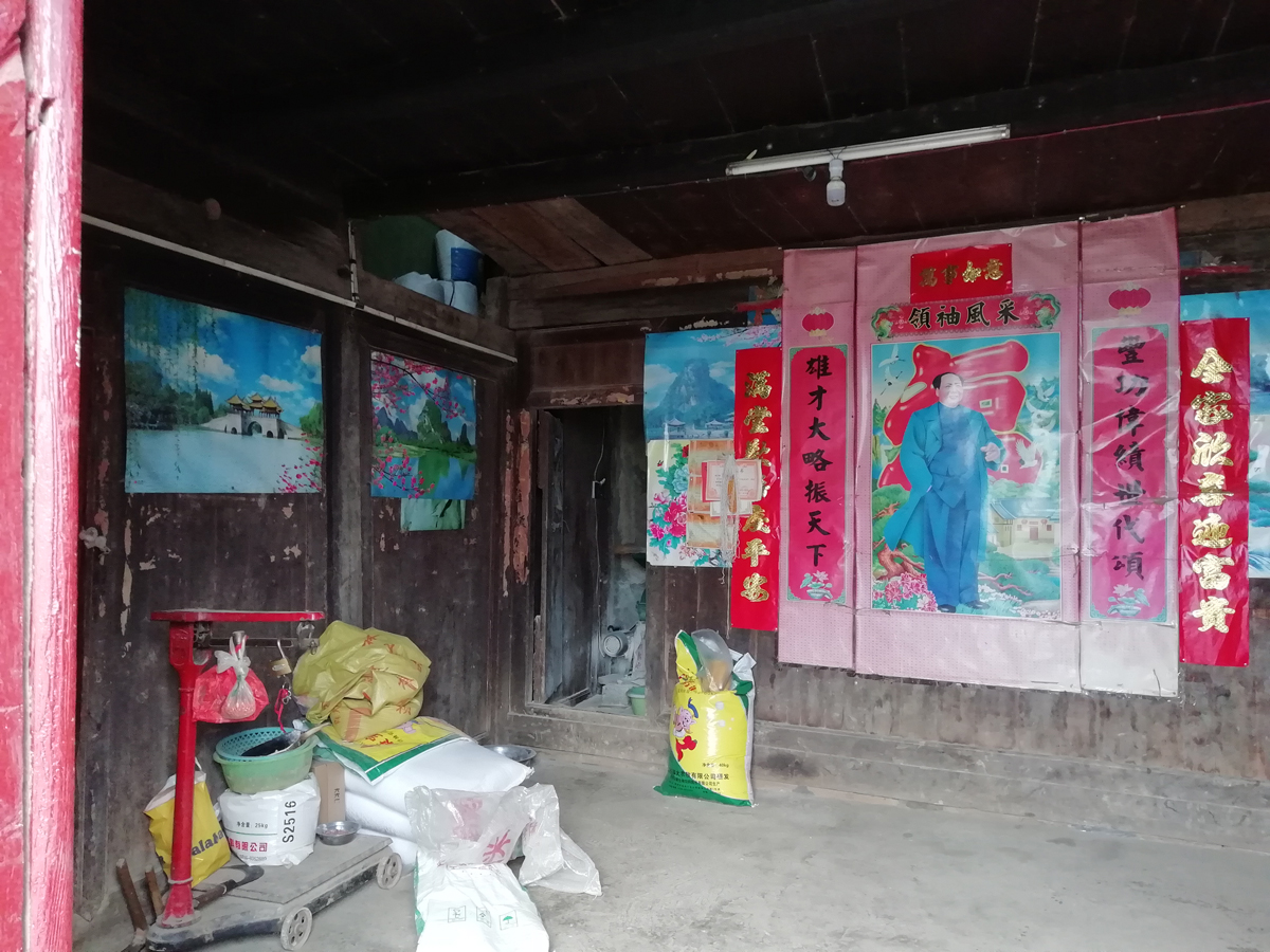 小邱家的院子,左側(cè)是三間豬圈,地上曬著木瓜,往前走便是主屋。主屋里的中堂掛著毛主席的畫(huà)像,兩側(cè)貼滿的小邱同學(xué)上學(xué)期間的獎(jiǎng)狀。